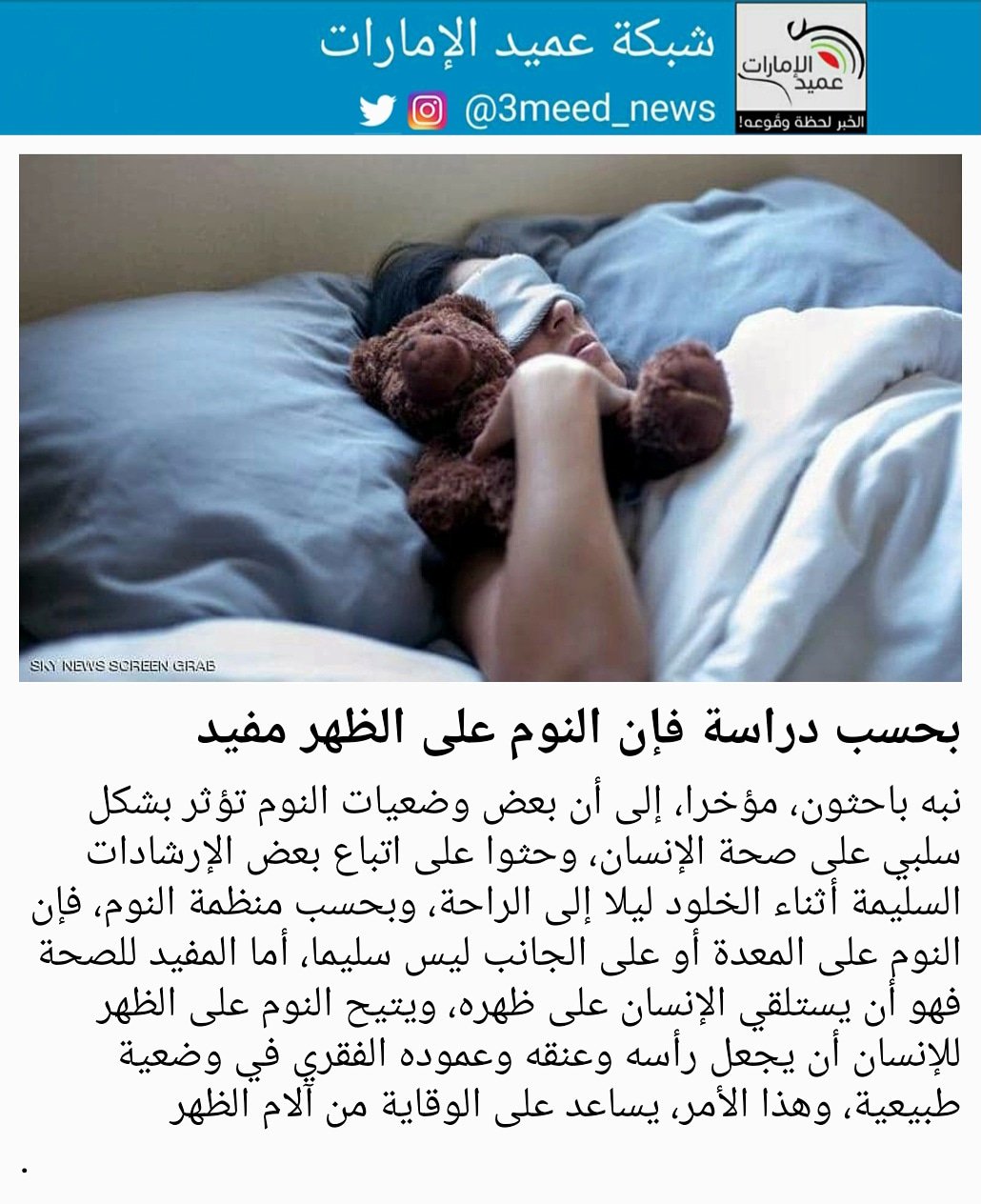 شبكة عميد الإمارات twitterissa نبه باحثون مؤخرا إلى أن بعض وضعيات النوم تؤثر بشكل سلبي على صحة الإنسان وحثوا على اتباع بعض الإرشادات السليمة أثناء الخلود ليلا إلى الراحة وبحسب منظمة النوم